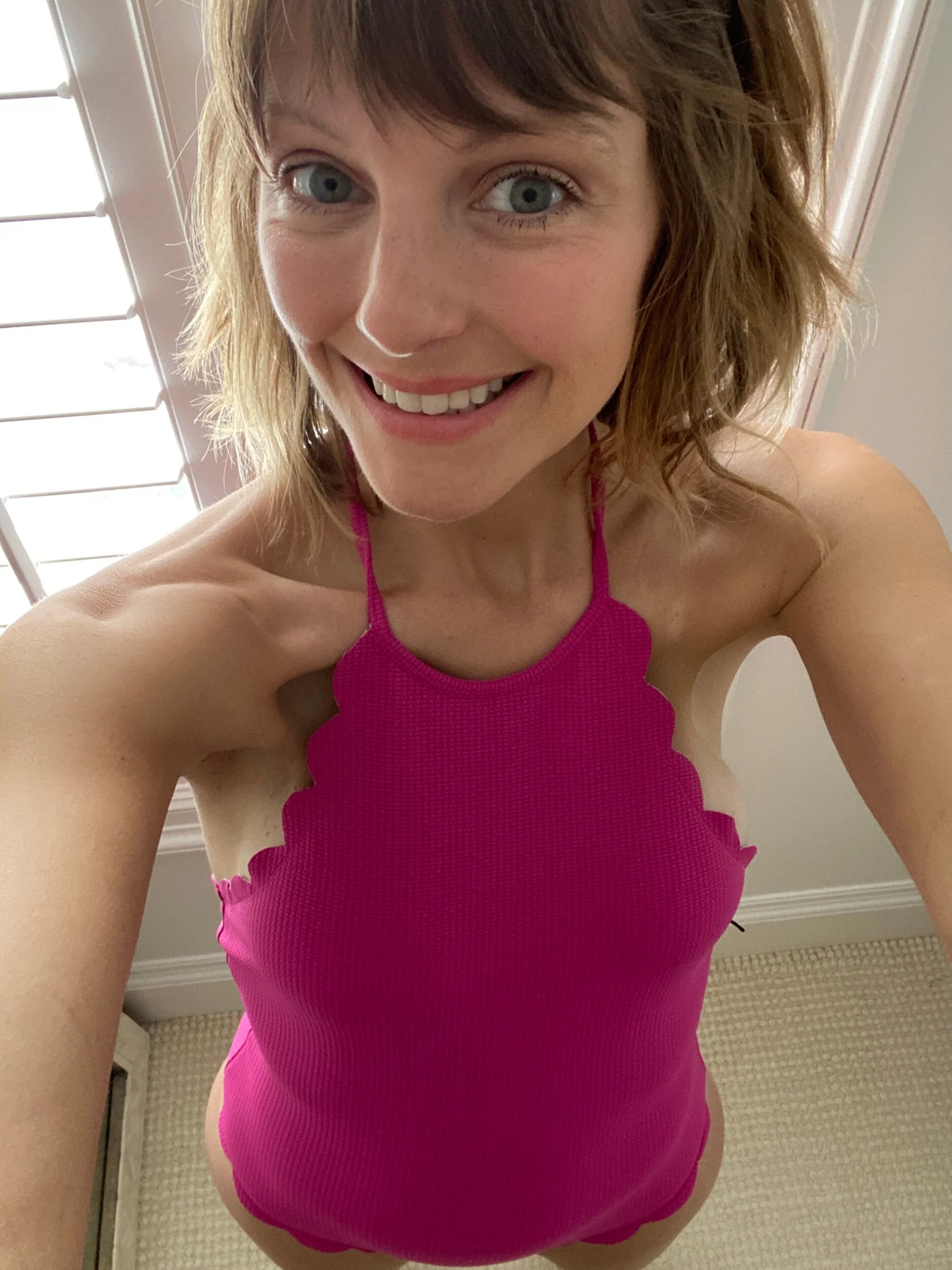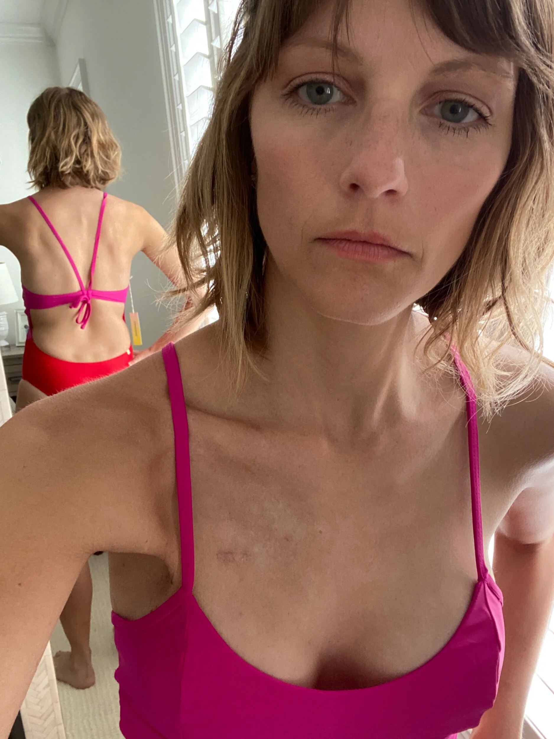 The blue one piece is the suit i purchased a few years ago. It’s my blue baywatch suit. I feel very comfortable in in. The black one piece with the snaps on the top is so comfortable and I love the option of wearing it open or closed. It covers up my port scars, but also can be sexy. The red two piece doesn’t cover all of the scars, but it fits great and the color is eye popping but classy! It’s a simple suit that i felt good in.