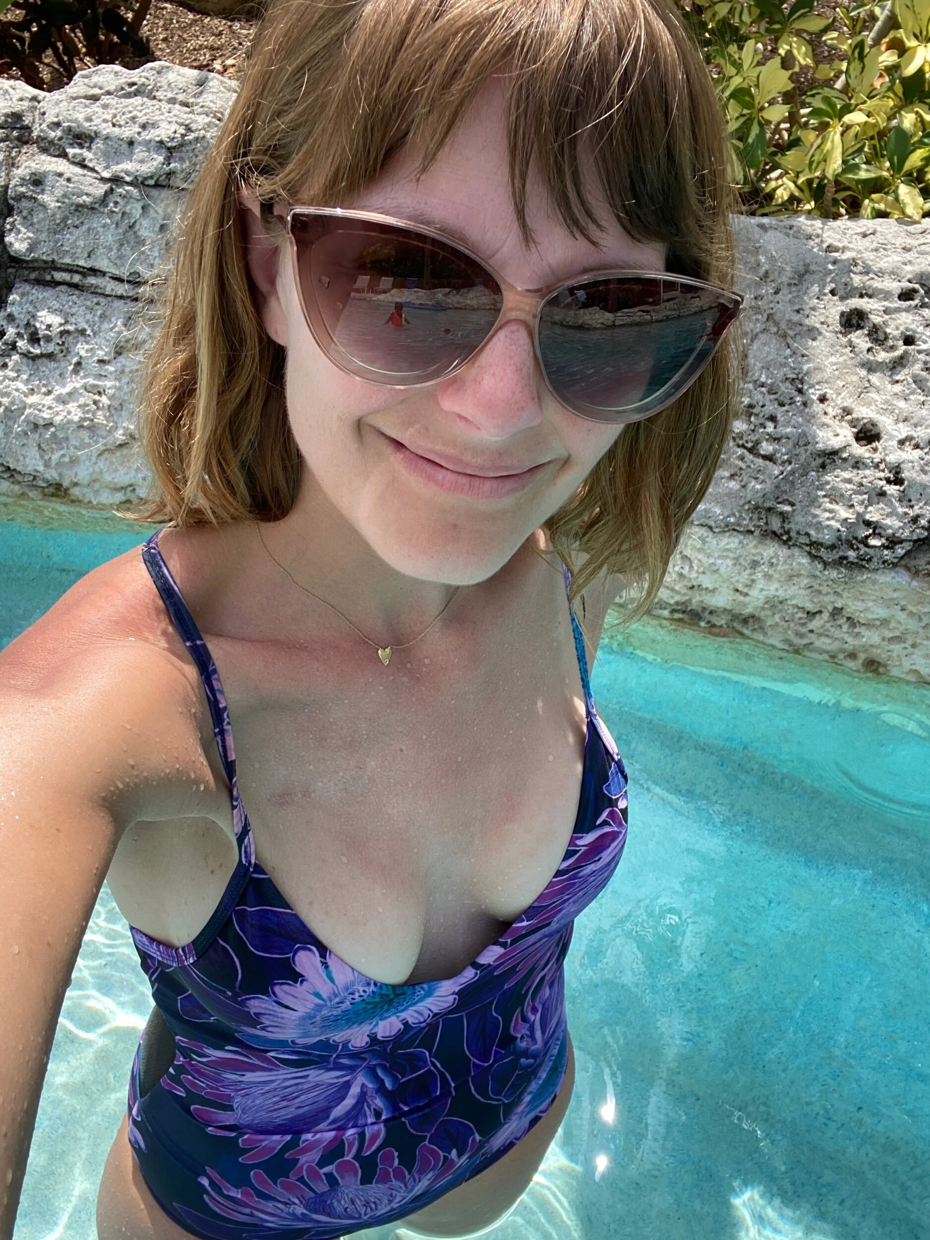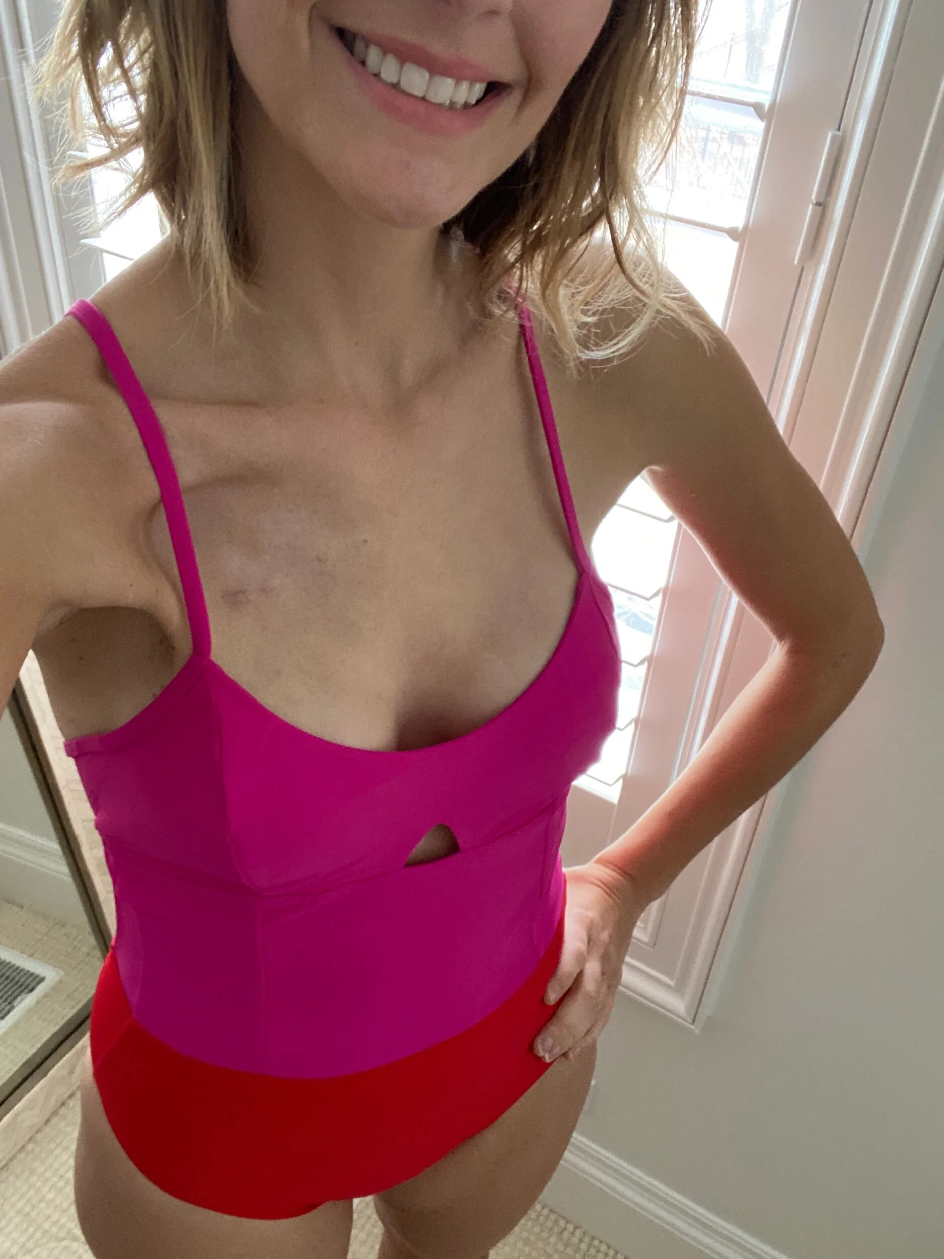 After chemo and before surgery, I traveled to South Carolina for a break from treatment. Knowing that I needed to protect my skin from the sun, I invested in a suit that had a rash guard as well as a suit with a high neck to cover my port. I felt comfortable as I still had my natural breasts. Little did I know that in a few months, I’d have to start fresh with my collection of suits. Surgery was in August so I had all Fall, Winter and Spring to prepare for the next summer. I started to look at a few swim brands, but honestly wasn’t very motivated as I wasn’t ready to see my new body in a swim suit. One of the reasons I chose to have reconstruction was because of the summer and swimming. Now I had to figure out how to get myself out in the sun and into the pool.