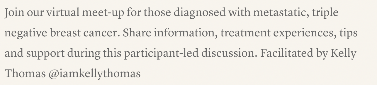 Metastatic Mondays with TNBC Friends Monday, March 11, 2024 6:00 PM 7:00 PM 18:00 19:00 Liv & Let Chicago, IL 60618 (map) Google Calendar ICS Metastatic Mondays with TNBC Friends Mar 11, 2024 06:00 PM CST Register
