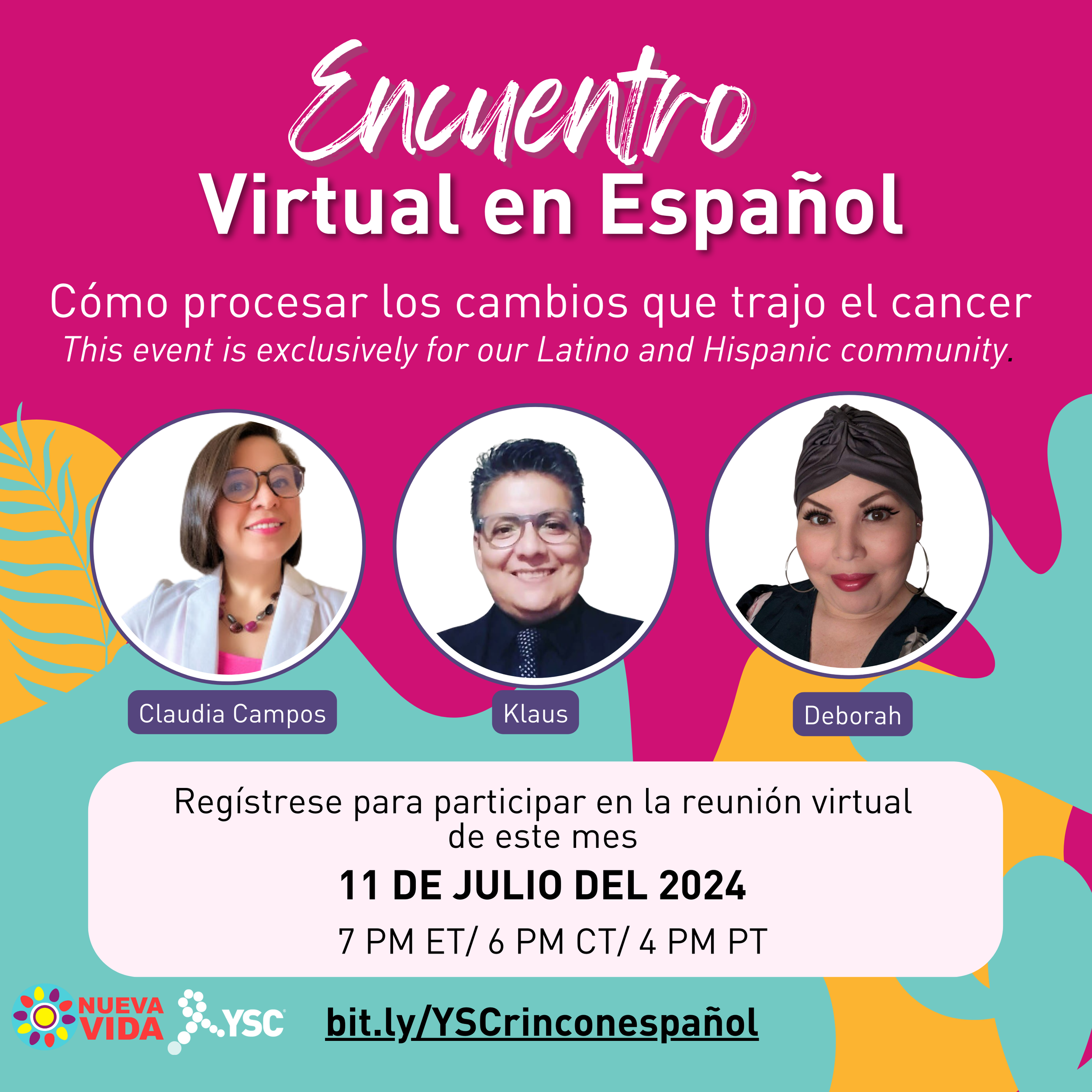 Young Survival Coalition ha lanzado una nueva serie de Hangouts Virtuales adaptados a la comunidad hispana y diseñados exclusivamente para supervivientes de habla hispana. Estas reuniones virtuales trimestrales exploran 4 temas educativos distintos durante cada sesión. El tema de este mes aborda el proceso de duelo y cómo procesar los cambios provocados por el cáncer. Para más detalles, visite www.youngsurvival.org.