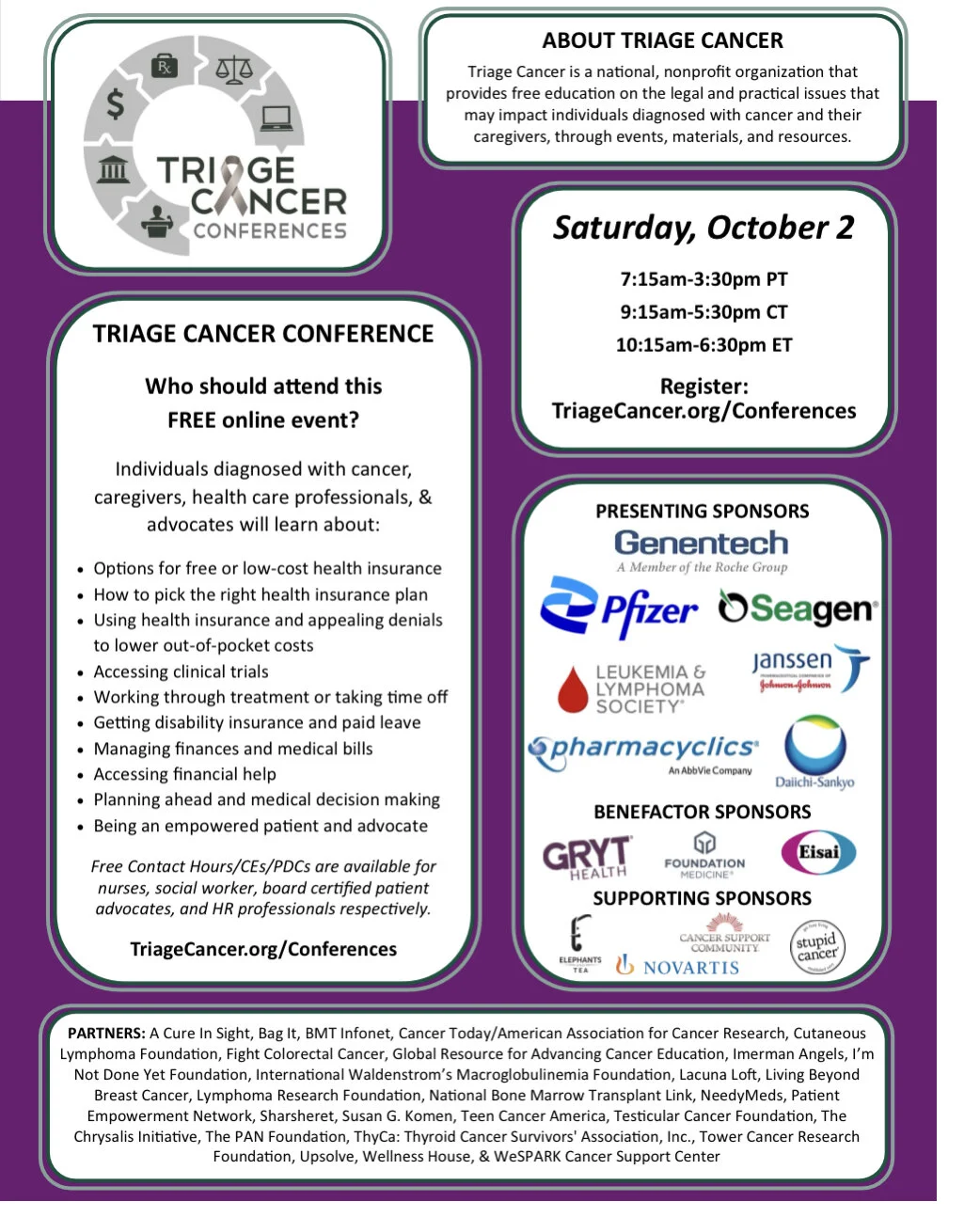 Triage Cancer offers a series of FREE educational conferences for individuals diagnosed with cancer, caregivers, advocates, and oncology healthcare professionals. Learn valuable information about the legal and practical issues that arise after a cancer diagnosis that can help manage finances and avoid the financial burden of a cancer diagnosis.